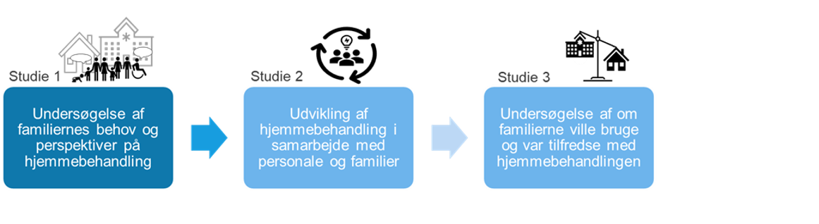 Det første studie undersøgte forældrenes behov og perspektiver på hjemmebehandling. Det andet studie fokuserede på at udvikle selve hjemmebehandlingsmodellen i tæt samarbejde med både personale og familier. Det tredje studie evaluerede, om familierne kunne bruge modellen i praksis – og om de var tilfredse med den.