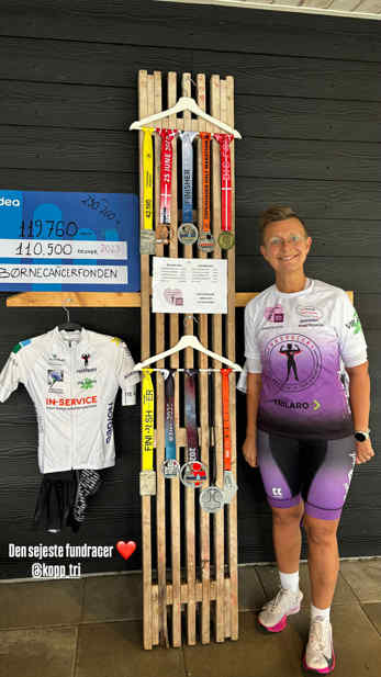 Annette med alle sine medaljer samt dragten fra 2025. Billedet er fra den fest Annette holdte forrige måned for alle som har bidraget til hendes projekt og hjulpet hende igennem.